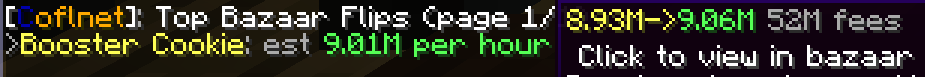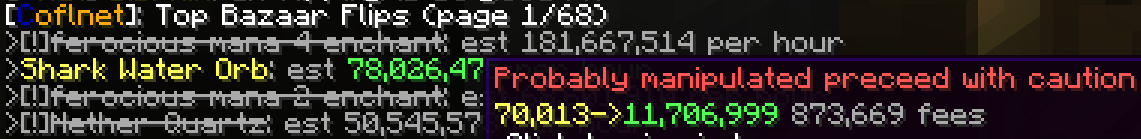➡️ Started building bazaar flipper. Currently its just average volume times spread. Its available to everybody with /cofl bazaar or /cl bz. Has no anti-market manipulation since you could profit from a manpulated item. Please let me know what you think.