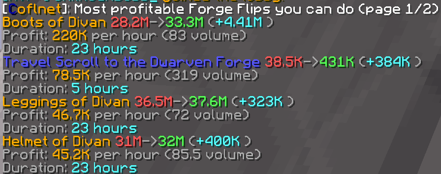 ➡️ Added /cofl forge. It displays you the most profitable (per hour) forge flips that you can do with your hotm level and includes quick forge stats. As suggested by @balls45.